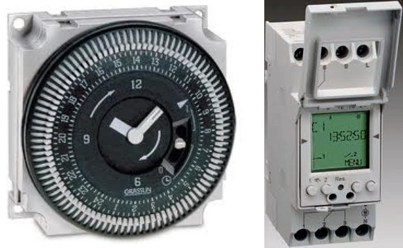 Il programmatore orario è un oggetto molto conosciuto anche dall'utilizzatore finale dell'impianto elettrico di casa (ossia da chi ci abita). Chi non ha mai avuto a che fare con i chiodini o levette dei programmatori elettromeccanici, o chi non si è mai trovato ad armeggiare con i pulsanti e gli enigmatici menu di un programmatore orario elettronico con display lcd? Questi oggetti o componenti sono presenti sia in versione da quadro elettrico che in versione "spiccia", come un piccolo elettrodomestico. Alcuni esempi di questi componenti sono riportati nella seguente figura: