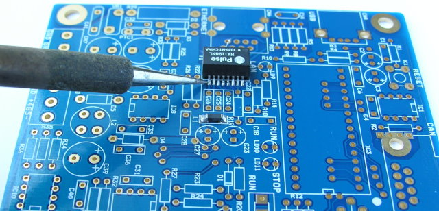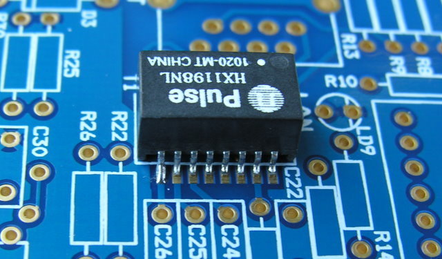 Per il montaggio ho utilizzato un saldatore a stilo di media potenza termoregolato, con una punta media ed una più sottile. Infatti la scelta di non usare componenti SMD, per evitare l'uso di attrezzi più particolari, non mi è stata possibile solo per un paio di componenti. Si tratta della piccola induttanza L1 e del trasformatore T1 di segnale della porta Ethernet che sono componenti dove il "pressing" della tecnologia SMD si fa piuttosto sentire. Tuttavia il passo (1.27mm) del trasformatore consente agevolmente la saldatura con una punta conica sottile come si vede nelle successive immagini.