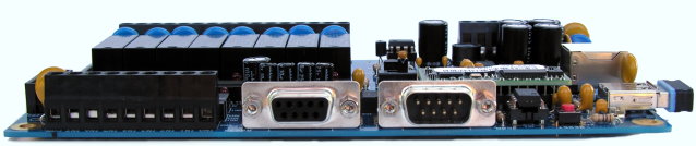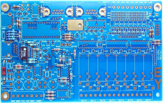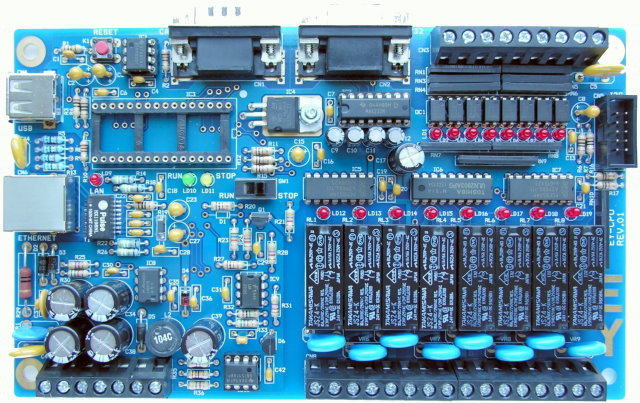 Come si vede i componenti non sono poi tanti, almeno per quello che dovrà essere in grado di fare la scheda. Sono infatti stato più essenziale possibile, in quanto lo scopo era quello di realizzare un PLC didattico ma che al tempo stesso potesse funzionare come un vero PLC. Per questo ho voluto fare un apparecchio completo di IO (8 ingressi + 8 uscite) per poter provare i programmi IEC connettendolo anche a qualcosa di reale (lampade, motorini, pulsanti ed altro). Conseguentemente le interfacce di IO hanno fatto lievitare questa quasi "manciata" di componenti, tanto che la precedente "foto di gruppo" è occupata, per ben oltre la metà, da quelli utilizzati per realizzare gli ingressi ed uscite digitali. A questo proposito voglio esprimere una mia opinione di progettista: l'interfacciamento al mondo esterno di una scheda per l'automazione è spesso la parte più ingombrante e brutta. Basta guardare nel centro della foto come è piccolo e bello il processore e quanto sono grossi e brutti i relè in alto a destra, i varistori (quelli blu), le morsettiere ed i connettori in alto. Anche buona parte dei componenti in basso (condensatori, leds, reti resistive e resistenze) ed alcuni integrati a sinistra, servono per le interfacce di ingresso ed uscita digitali.