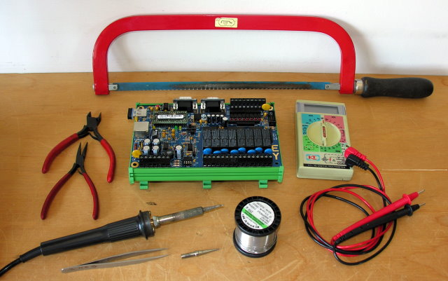 Al termine del duro lavoro convinco i miei "fidati collaboratori" a partecipare ad una foto di gruppo assieme alla nuova creatura. Al saldatore vanno i maggiori meriti per il suo instancabile lavoro che svolge, senza mai protestare, da più di 20 anni. Le pinzette hanno contribuito alla saldatura della piccola bobina SMD, mentre le pinze e tronchesine hanno piegato i terminali dei componenti e tagliato le parti in eccesso dopo la saldatura. Il multimetro ha confermato il funzionamento dell'alimentatore prima di inserire definitivamente il processore nello zoccolo. Infine non poteva mancare il "segaccio" il cui contributo è stato fondamentale per il taglio del guscio in plastica.