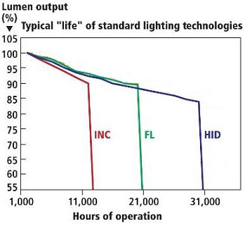 La principale difficoltà nasce dal fatto che la stima della vita utile di tecnologie standard di illuminazione è definita come tempo di filamento o come failure del catodo. Per la maggior parte di queste lampade, il periodo di tempo prima del guasto presenta livelli accettabili di emissione di luce, con successiva rottura istantanea, come mostrato nella figura sottostante.