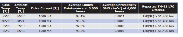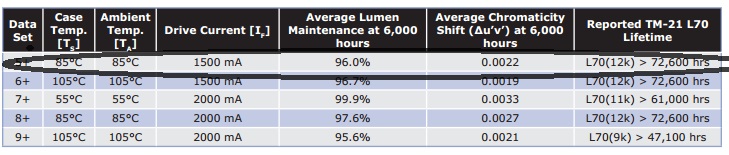 - LED XT-E a 600 mA e ad una Ts di max 70°C (con 25°C di temperatura ambiente): siamo quindi in una situazione migliorativa di quella cerchiata in rosso, perché la corrente è poco più della metà (da 1000 mA a 600 mA) e la temperatura è più bassa di 15°C. Ad oggi, in virtù dei dati misurati, la TM-21 stima una vita maggiore di 36.300 ore a fronte di un deprezzamento dell’1,2% dopo 6mila ore.