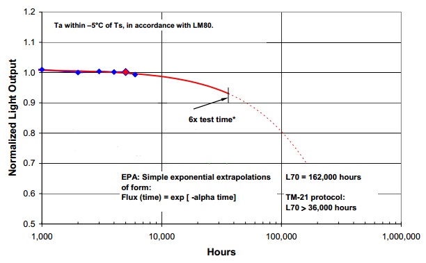 A partire da questi dati, si può utilizzare il metodo cosiddetto EPA per spingersi a stimare la reale durata prevista dei LED in questione.