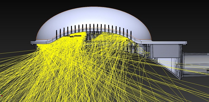 - 2. Il flusso reale del LED è il flusso luminoso di partenza del lampione. Il corpo illuminante però, per raggiungere i requisiti richiesti dalle norme, introduce delle perdite di efficienza. Nel caso della riflessione totale le perdite sono dovute al fatto che le superfici riflettenti assorbono una percentuale della luce incidente. Ad ogni rimbalzo c’è quindi una perdita di efficienza dell’8% circa. Aumentando il numero di rimbalzi, aumentano esponenzialmente le perdite. Nel caso della nostra calotta, avendo studiato ed ottimizzato la calotta per avere al più due rimbalzi, abbiamo una efficienza del 88%, quindi con un’ulteriore perdita del 12%.