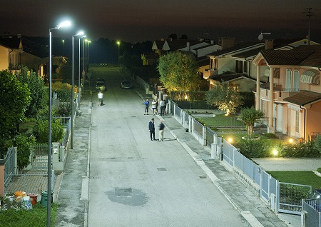 Prima parte della strada illuminata con Deflecto a 32 LED (64W di consumo totale), seconda parte con Vapori di Mercurio a 125W (più alimentatore).