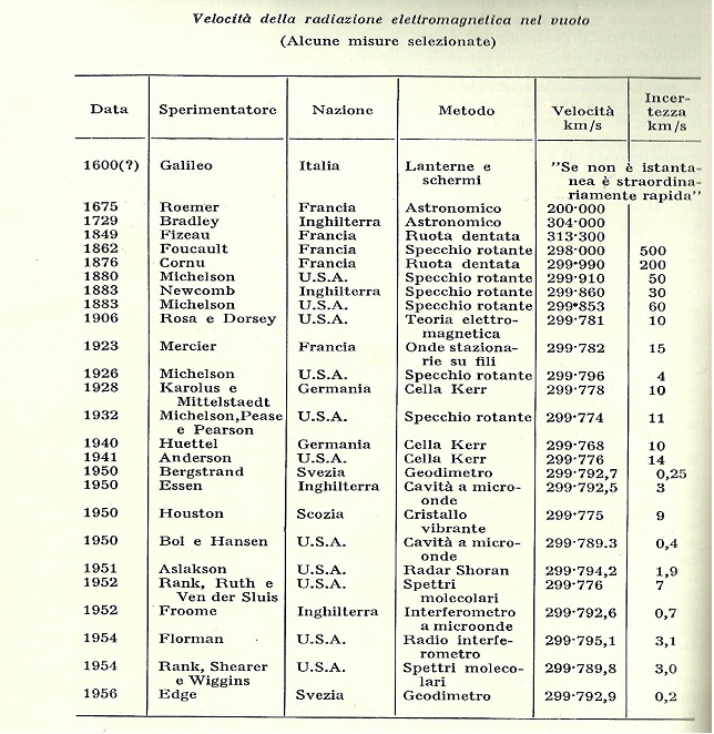 La tabella che segue mostra alcune delle misure della velocità della luce fatte dai tempi di Galilei e va inteso per certi aspetti come un simbolo della tenacia e della caparbietà umana. Ne sono un esempio l'ultima colonna della tabella stessa, quella relativa cioè all'incertezza nella misura, che è migliorata nel tempo ma anche la varietà di metodi con cui sono state condotte le misurazioni.