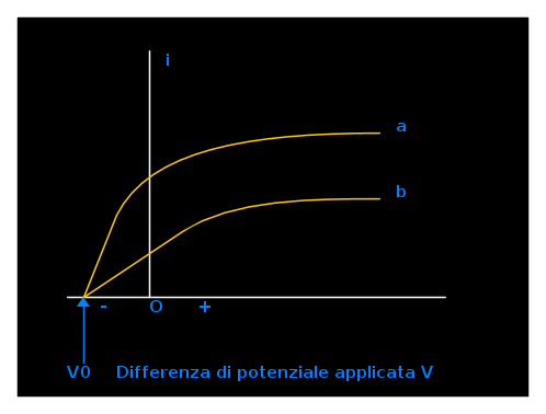 essa (curva a) rappresenta il grafico della corrente fotoelettrica in un apparecchio simile a quello schematizzato sopra, in funzione della differenza di potenziale V. Se V è abbastanza grande la corrente fotoelettrica arriva fino ad un certo valore limite ed in corrispondenza di tale valore tutti i fotoelettroni che sono emessi dalla lastra A sono raccolti dalla cavità B.