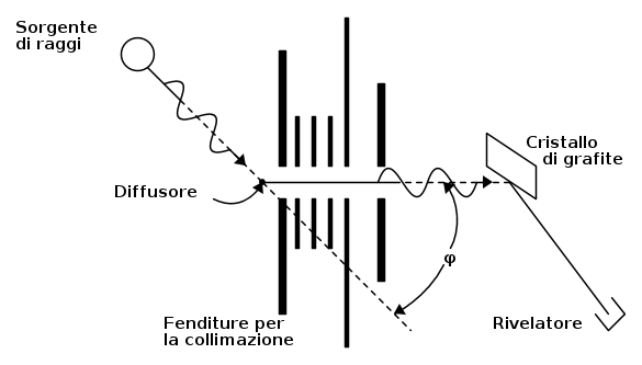 Compton inviò un fascio monocromatico di raggi X di lunghezza d'onda λ su un blocco di grafite, come schematizzato nella figura che segue e misurò, per diversi angoli di diffusione, l'intensità dei raggi X in funzione della lunghezza d'onda: