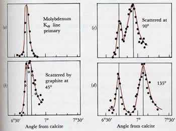 Si vede che per quanto il fascio incidente abbia una sola lunghezza d'onda λ, i raggi X diffusi hanno dei picchi di intensità a due lunghezze d'onda; uno di essi corrisponde alla lunghezza d'onda incidente e l'altro alla lunghezza d'onda λ' più grande della precedente di Δλ, che è denominato spostamento Compton, il quale varia con il variare dell'angolo a cui i raggi X diffusi sono osservati.