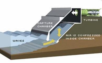 - sistemi OWC : sfruttano il principio della colonna d'acqua oscillante; l'energia elettrica si ottiene mediante un processo di carattere pneumatico che è associato al principio di funzionamento delle turbine Wells : l'onda ascendente e discendente provocano una compressione ed una decompressione d'aria (rispettivamente) all'interno della camera in cui è situata la turbina, mettendola così in rotazione; il range di potenza varia da 60 a 1000 kW.