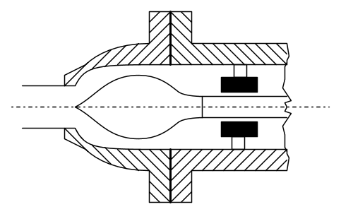 Esso è costituito da un condotto fortemente convergente nella parte finale, con al centro una spina otturatrice che scorre in direzione assiale grazie all'azione di un servomeccanismo e consente di aprire e chiudere l'ugello e di regolare la macchina.