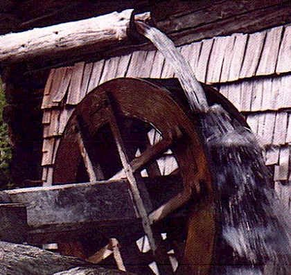 - impiegando il peso dell'acqua in delle apposite cassette, le quali vengono riempite nella parte superiore e svuotate poi in maniera graduale verso il basso per via della rotazione, come avviene nel caso della ruota idraulica a cassette (immagine tratta da http://web.tiscalinet.it/smsverdi/energia/ruotaidraulica.htm) :