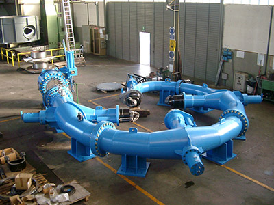 Un esempio di voluta a chiocciola di turbina Francis e distributore ci è dato, invece, dalla seguente figura (tratta da http://www.cmr-hydro.it/prodotti-turbine-francis1.htm) :