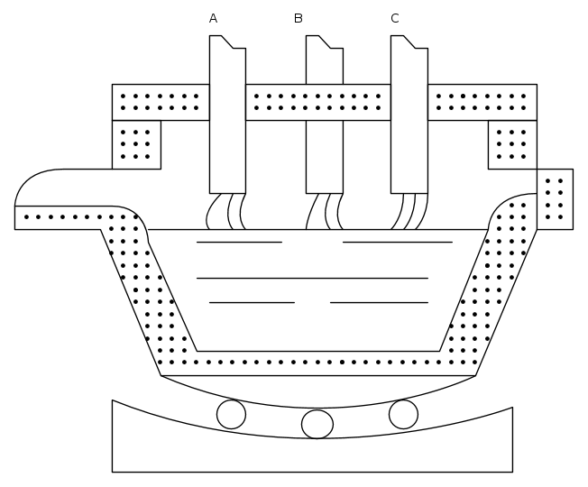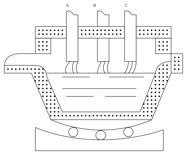 Questi sono regolarmente dei forni trifasi : si hanno in essi tra archi tra la massa metallica che assume le funzioni di neutro e tre elettrodi A,B,C collegati ciascuno con le tre fasi di alimentazione.