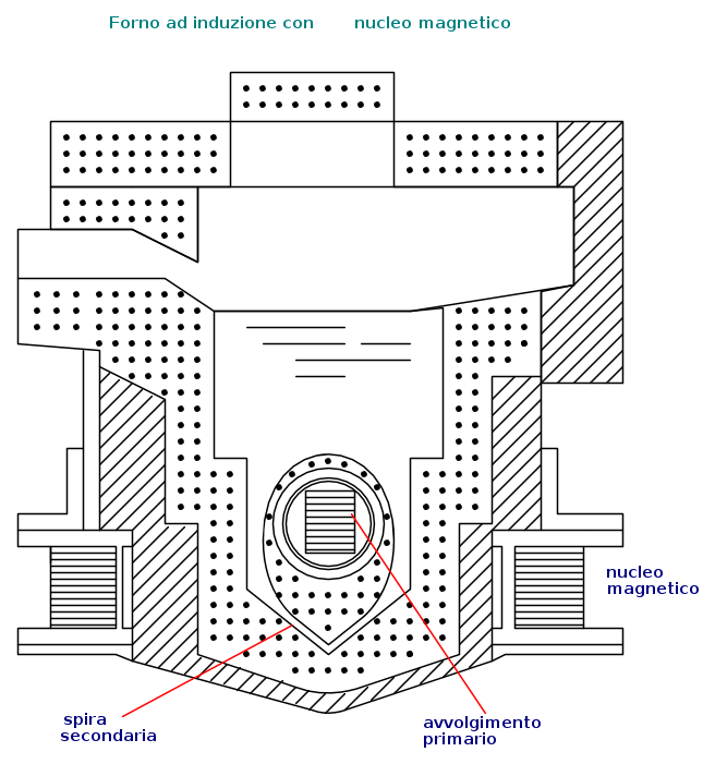 In forni del genere il buon concatenamento tra il primario e il secondario è assicurato dalla grande permeabilità del ferro e la frequenza di alimentazione può essere quella delle reti di distribuzione.