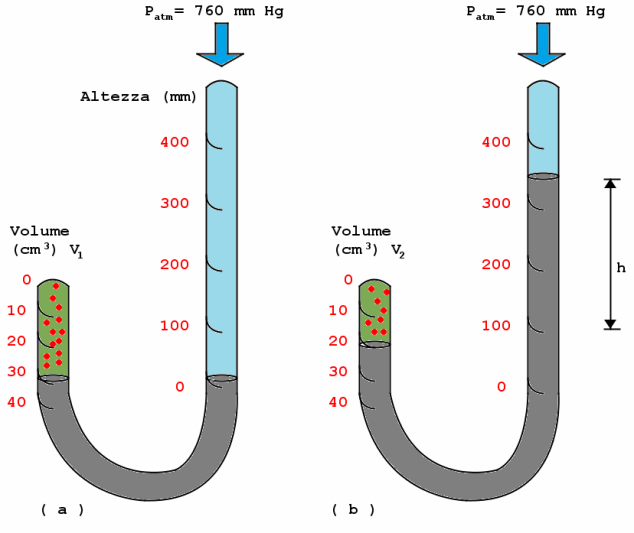 Il volume dell'aria racchiusa può essere letto sulla scala del tubo precedentemente calibrato, mentre la temperatura è mantenuta costante dall'ambiente che circonda il tubo.