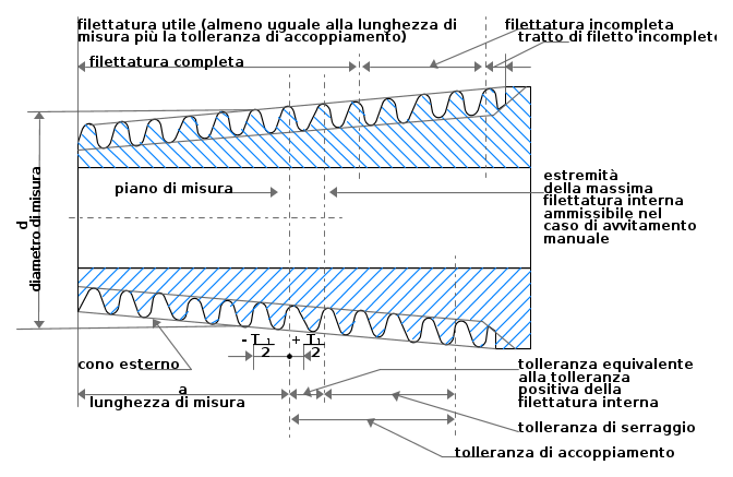 Per quanto riguarda invece le filettature coniche a tenuta stagna sul filetto, per determinare la geometria del profilo si ricorre ad un piano di misura prefissato a cui si riferiscono tutti i vari parametri geometrici, come possiamo vedere dalla seguente figura (che ho per motivi di spazio ho dovuto suddividere in varie figure che quindi vanno intese, spazialmente parlando, come un' unica figura).