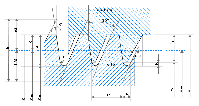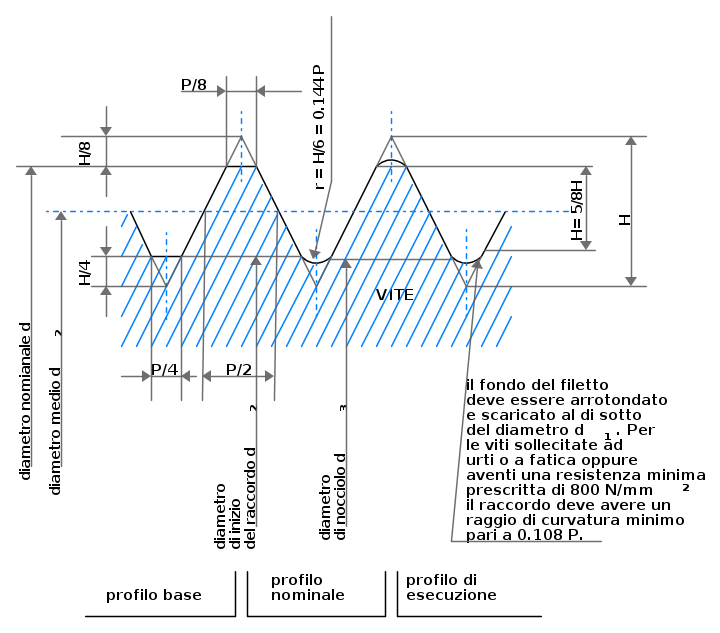 Il profilo nominale della madrevite è uguale a quello base, quello della vite è diverso giacché sul fondo i filetti presentano un arrotondamento con raggio r = H / 6 che si rende necessario sia per motivi di fabbricazione che per motivi legati alla resistenza della filettatura.