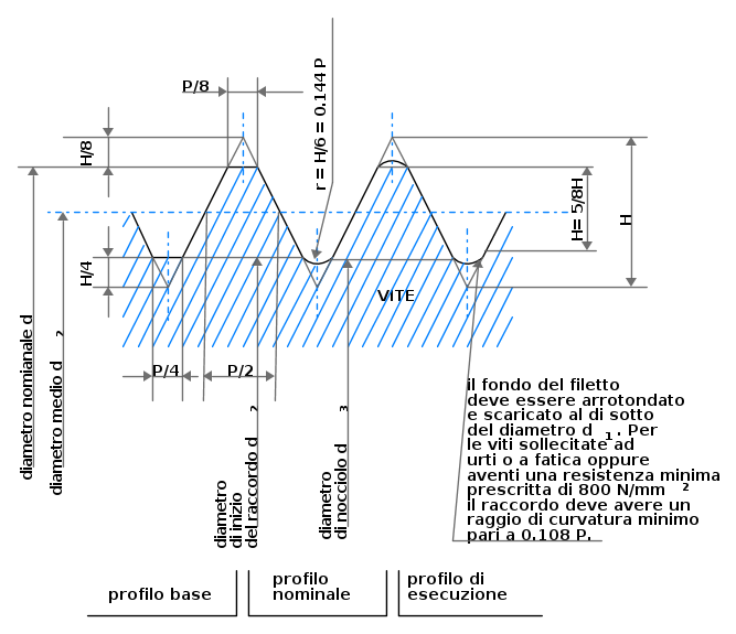 Da un triangolo equilatero con il lato uguale al passo e che ha la base parallela all'asse della filettatura, deriva il profilo base che i vertici troncati.