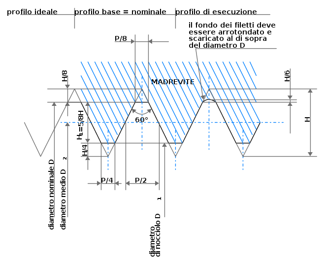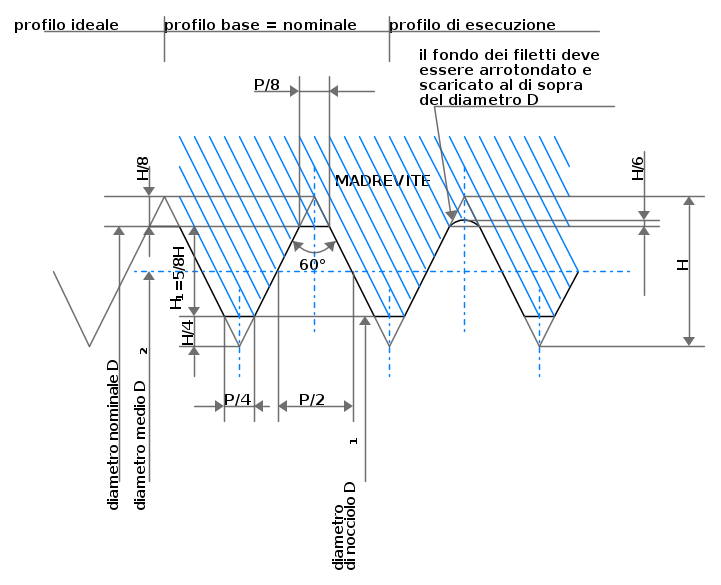 Nella figura che segue sono rappresentati i profili della filettatura simmetrica ISO a profilo triangolare per la madrevite. Esistono quattro tipi possibili di profili: ideale, base, nominale e d'esecuzione.