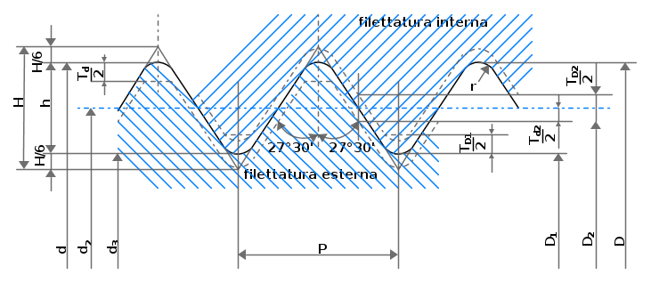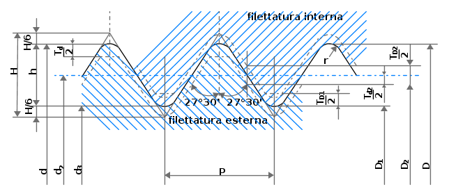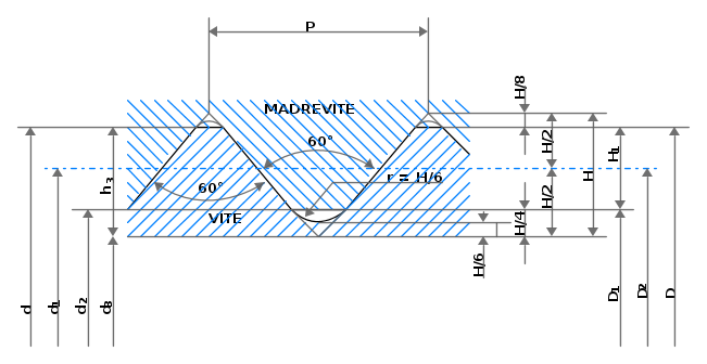 in riferimento alla figura che segue che rappresenta gli elementi geometrici del profilo nominale per le filettature metriche ISO:
