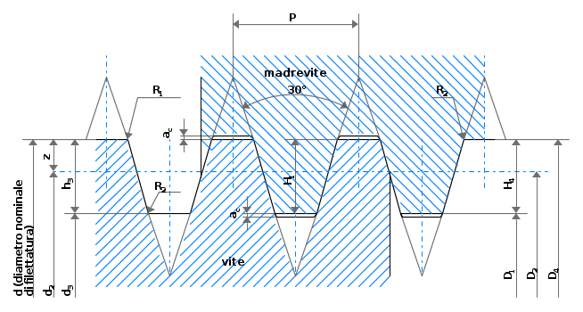Nella figura seguente è mostrata la filettatura trapezoidale, mentre la tabella riporta le formule di dimensionamento.