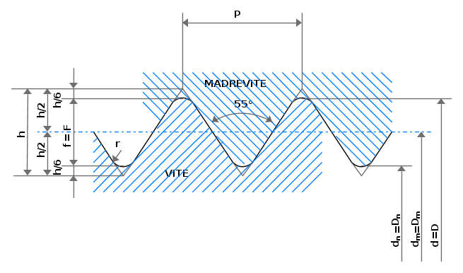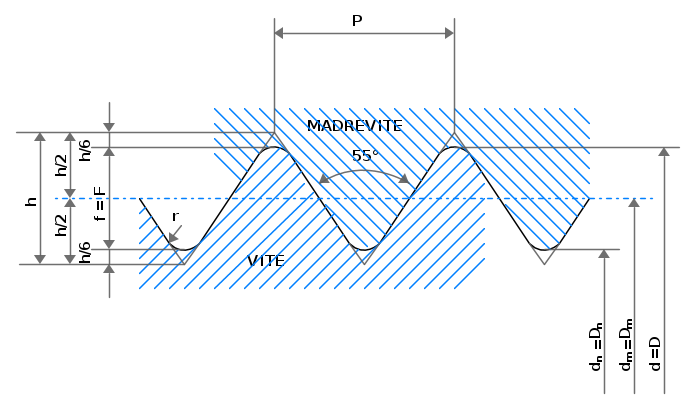 Questo tipo di filettature è basato su un triangolo generatore con un angolo del profilo di 55°. Fondo e cresta del filetto sono arrotondati sia nella vite che nella madrevite.