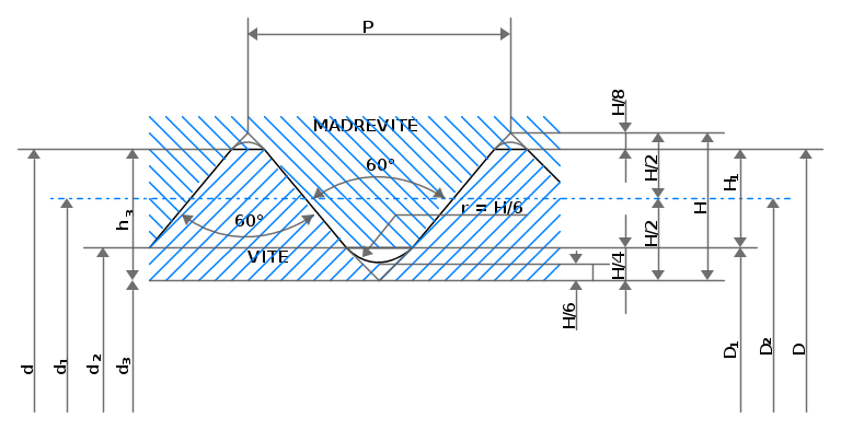 Nella figura che segue, invece, sono presentati i profili della dilettatura metrica ISO per la vite.