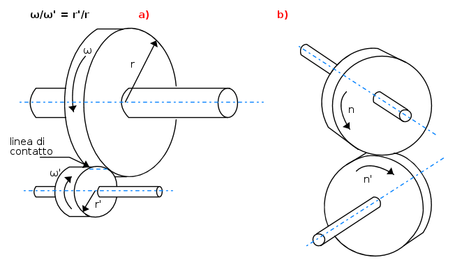 Nelle trasmissioni rigide la trasmissione può avvenire tramite una ruota calettata sul primo albero, la cui superficie periferica liscia preme sulla corrispondente superficie di una ruota calettata sul secondo, come si vede dalla figura che segue: