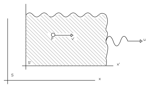 Una sorgente di luce, a riposo nel sistema di riferimento S', emette un impulso luminoso P la cui velocità v' viene misurata da un osservatore a riposo nel medesimo sistema. Dal punto di vista di un osservatore che si trovi nel sistema di riferimento S, il sistema di riferimento S' e l'osservatore ad esso relativo si muovono nella direzione positiva dell'asse x a velocità u.