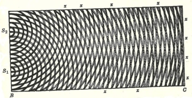 In essa si vede la regione compresa tra gli schermi B e C. Le zone annerite e quelle bianche sono i massimi ed i minimi (rispettivamente) delle onde. Avvicinando l'occhio al bordo sinistro della figura osservandolo in modo radente, si vede che lungo le linee indicate con x si ha un annullamento delle onde mentre nella zone compresa tra queste linee si ha un rafforzamento.