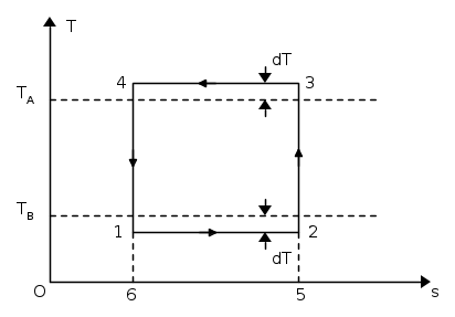 Si vede che l'area sottesa dalla isoterma superiore è diventata negativa (cioè qA < 0) e quella sottesa dalla isoterma inferiore è diventata positiva (cioè qB > 0) e quindi l'energia meccanica è negativa (cioè l = qA − qB < 0), cioè è l'ambiente a fornirla al sistema.