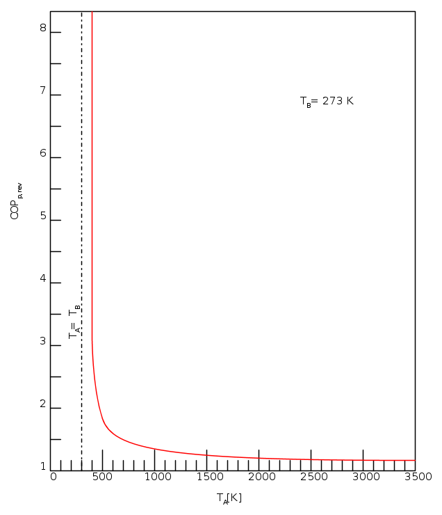 Nelle figure che seguono sono visualizzabili gli andamenti di COPf,rev e COPp,rev, avendo fissato per la macchina frigorifera TA = 300K e per la pompa di calore TB = 273K :