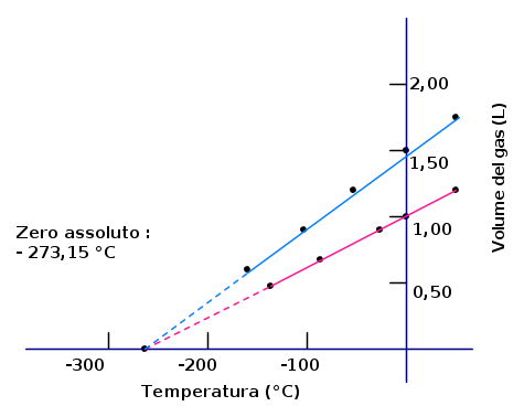 Il volume dovrebbe tendere a 0 e se la t andasse al di sotto di tale valore il volume diventerebbe negativo che è un risultato ovviamente assurdo. Si potrebbe sospettare quindi che -273,15 °C sia un limite fondamentale al di sotto del quale la temperatura non può scendere. Tutti i gas reali prima di giungere a questo zero assoluto di temperatura diventano liquidi o solidi e quindi l'esistenza di questo limite non può essere verificata semplicemente con una misurazione del volume dei gas.