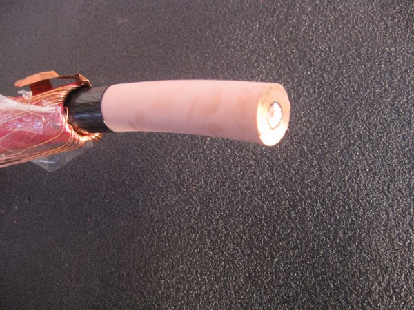 Dopo avere asportato la giusta porzione di guaina esterna e quella di semiconduttore esterno (*) (in questa fase attenzione a non incidere l' isolante HEPR, quello rosa) e dopo avere portato verso la coda del cavo i trefoli dello schermo, inserire l' elemento di controllo del campo elettrico (rispettando sempre le quote delle istruzioni di montaggio) e riscaldare con phon o con cannello (se del tipo termorestringente)