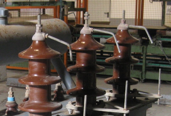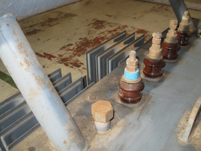 Oltre ai perni di fissaggio dei conduttori MT, sono evidenti gli isolatori in porcellana e gli scaricatori ad asta (elettrodi spinterometrici)