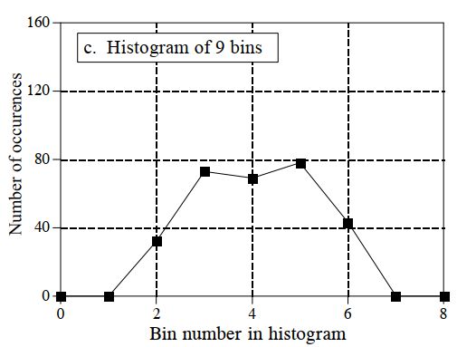 Ad esempio, immaginiamo un segnale in virgola mobile che contenga valori da 0.0 a 10.0 e un istogramma con 1000 bin; il bin 0 nell'istogramma è il numero di campioni nel segnale con un valore compreso tra 0 e 0.01, il bin 1 è il numero di campioni con un valore compreso tra 0.01 e 0.02 e così via, fino al bin 999 contenente il numero di campioni con un valore compreso tra 9.99 e 10.0.