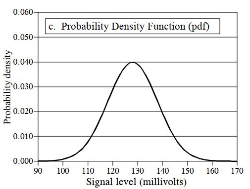 Ad esempio, prendiamo il nostro segnale generato dal generatore di rumore bianco. Qual è la probabilità che un campione di questo segnale abbia un valore pari a +120 mV? La figura precedente fornisce la risposta, 0,0547, ovvero circa 1 possibilità su 18.
