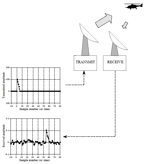 Un'antenna trasmette un breve burst di onde radio in una direzione selezionata. Se l'onda che si propaga colpisce un oggetto, come l'elicottero in questa illustrazione, una piccola frazione dell'energia viene riflessa verso un ricevitore radio situato vicino al trasmettitore. L'impulso trasmesso in questo esempio è per semplicitò il triangolo mostrato in questo esempio.