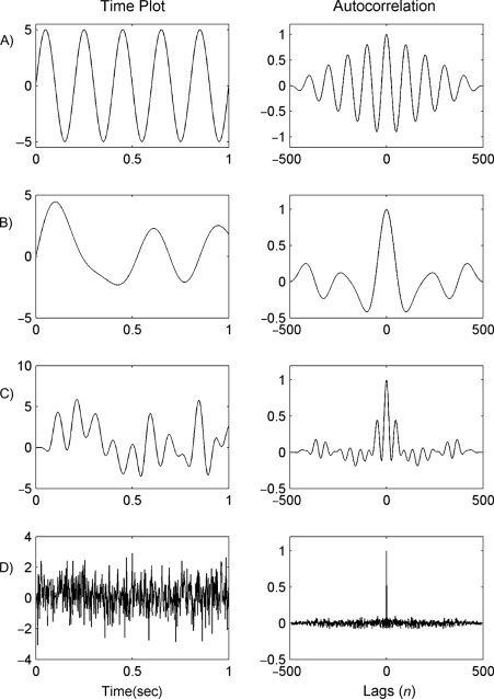 Questo esempio mostra come tramite l'autocorrelazione sia possibile "estrarre" informazioni da un segnale apparentemente composto da solo rumore, ed è una tecnica di analisi molto potente. Si faccia riferimento alla tabella precedente che mostra la funzione di autocorrelazione per un segnale sinusoidale con in più del rumore bianco (quarta riga della tabella, sine wave plus gaussian noise).