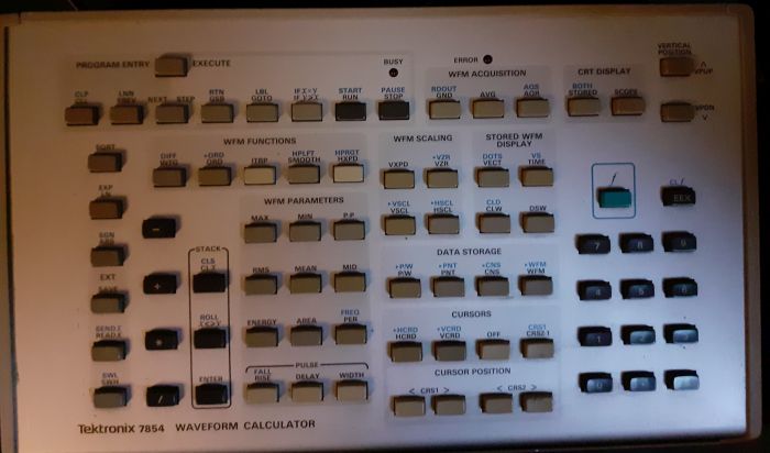 Di seguito una panoramica del 7854 con la sua tastiera, che la Tektronix chiamava Waveform Calculator: