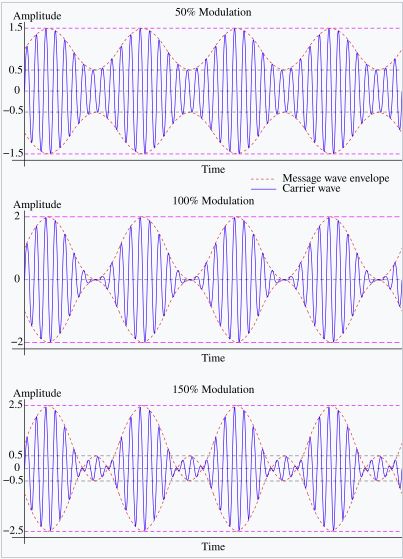 Quindi se m = 0,5, l’ampiezza della portante varia del 50% al di sopra (e al di sotto) del suo livello non modulato, come mostrato nella prima forma d’onda.