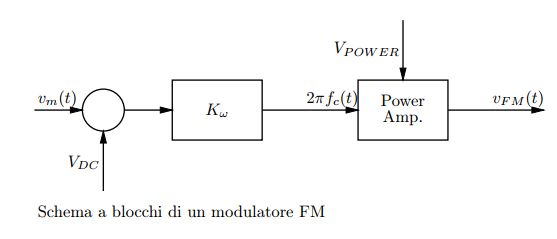 Per poter spiegare meglio come venga originato un segnale FM ho pensato di introdurre il seguente schema a blocchi, iper-semplificato, per illustrare passo-passo con chiarezza i passaggi che conducono all’espressione matematica finale di un segnale modulato in frequenza: Nello schema a blocchi: