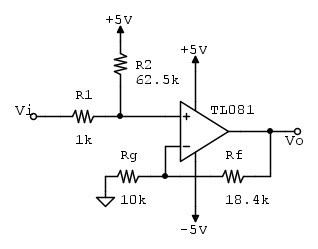 Vi risparmio in questo caso i dettagli dei calcoli fatti, che potete trovare nell'application note della TI "Single Supply Op Amp Techniques" che illustra e spiega molto bene tutte le casistiche possibili con un approccio sistematico e ordinato.