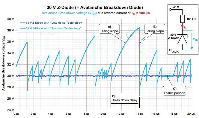La figura sottostante mostra la tensione di rottura di un diodo zener Z con una tensione di rottura di 30 V misurata con una corrente inversa di 100 μA. Si può notare come la tensione ai capi del diodo sia instabile.