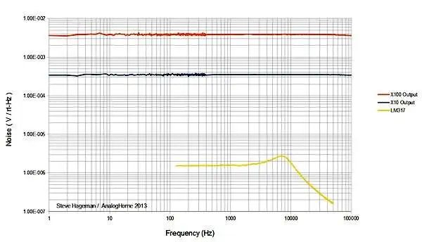 Inoltre Hageman illustra per confronto anche la curva di rumore del conosciutissimo regolatore di tensione LM317 che, come si può vedere, è discretamente rumoroso. Hageman lo definisce "Very Noisy Regulator", se non si utilizzano adeguate capacità di filtraggio.
