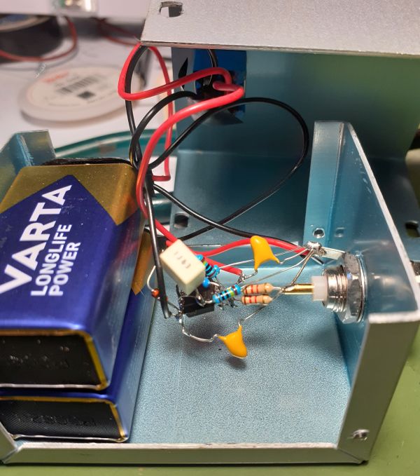 L'unica differenza rispetto allo schema originale è la resistenza da 1k in serie all'uscita: io ho utilizzato invece due resistenze da 1.2k in parallelo, per ottenere una resistenza di uscita di 600 ohm.