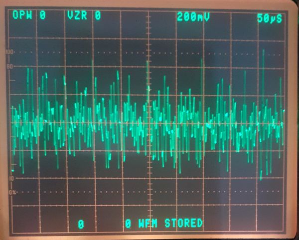 Il diodo "rumoroso" è un modello classico, della serie BZX o simile: per mostrare l'evoluzione tecnologica è visualizzata, con la stessa scala verticale, anche una curva in blu, che mostra un tipico diodo zener di ultima generazione: come si vede il rumore è drasticamente inferiore!