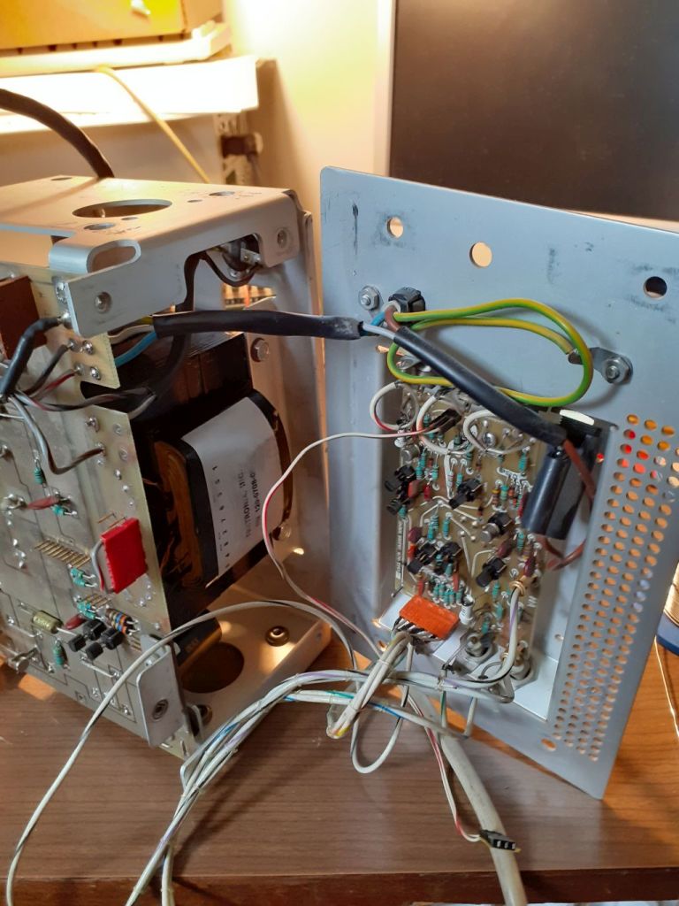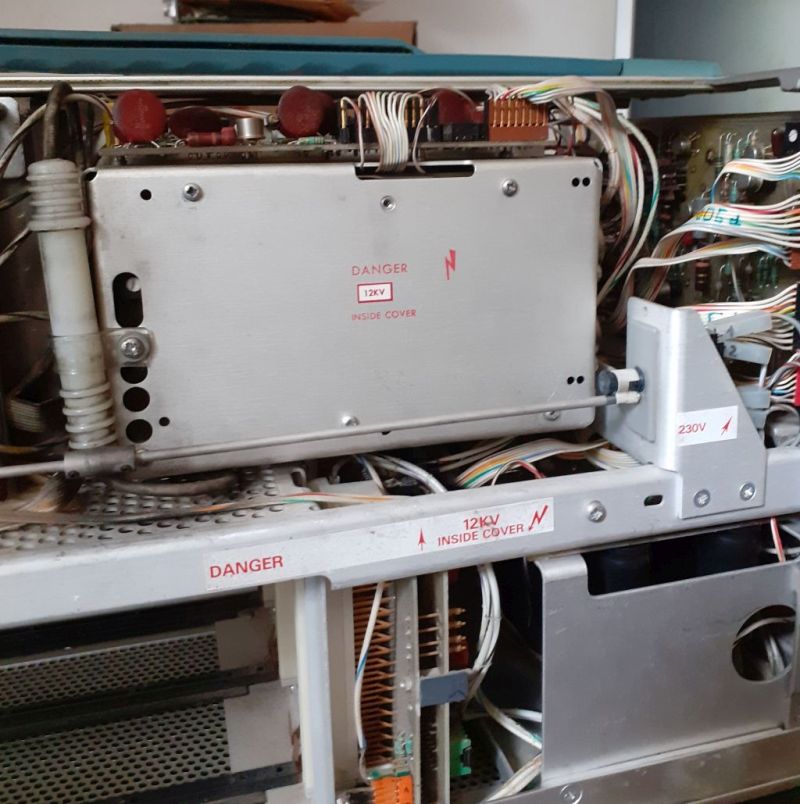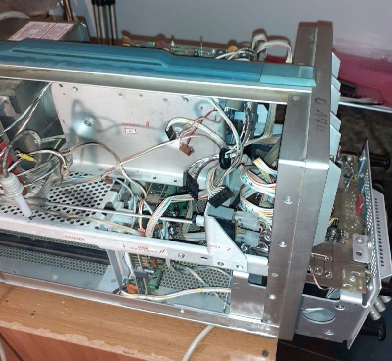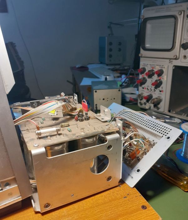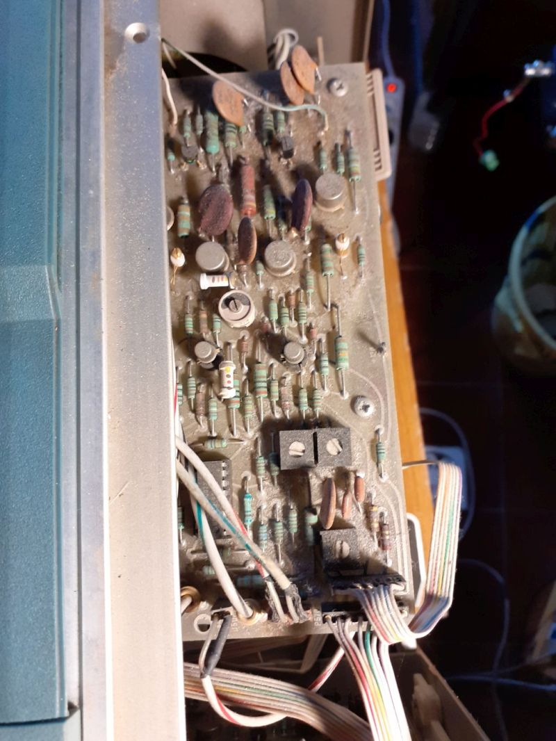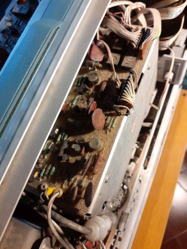 L'oscilloscopio era stato venduto come non funzionante. L'interno non mostrava rilevanti segni di "incendi". Qualche surriscaldamento sì, ma niente di troppo catastrofico; sicuramente doveva essere stato riacceso dopo essere rimasto inattivo molto tempo, come denota la sporcizia al suo interno: