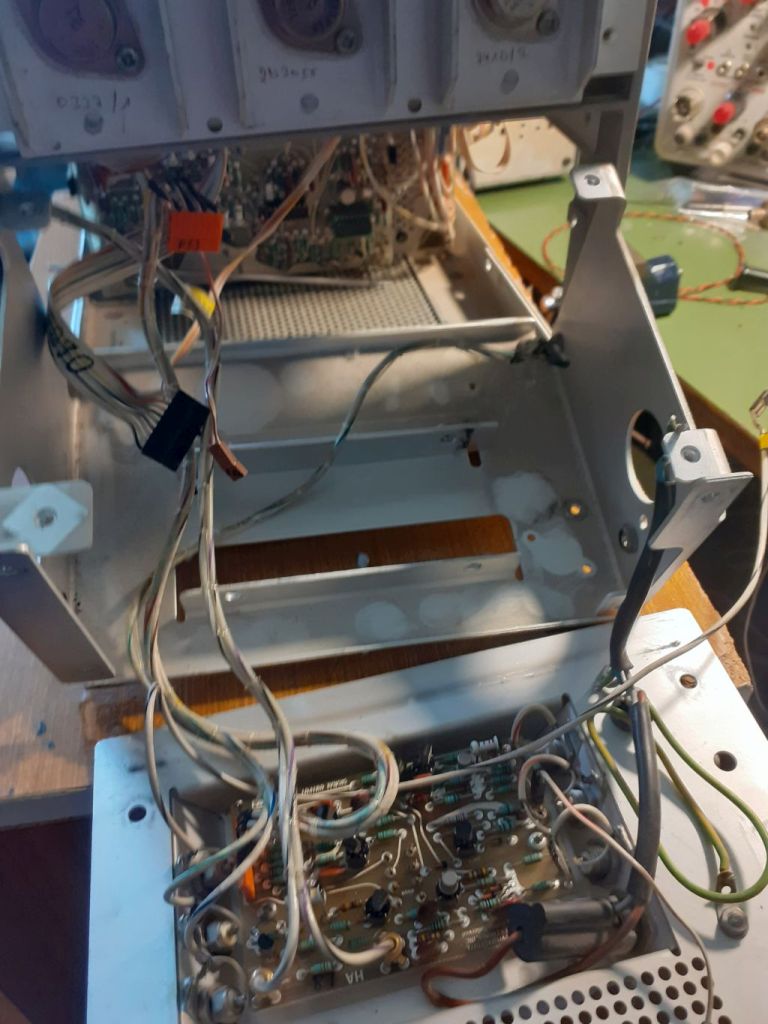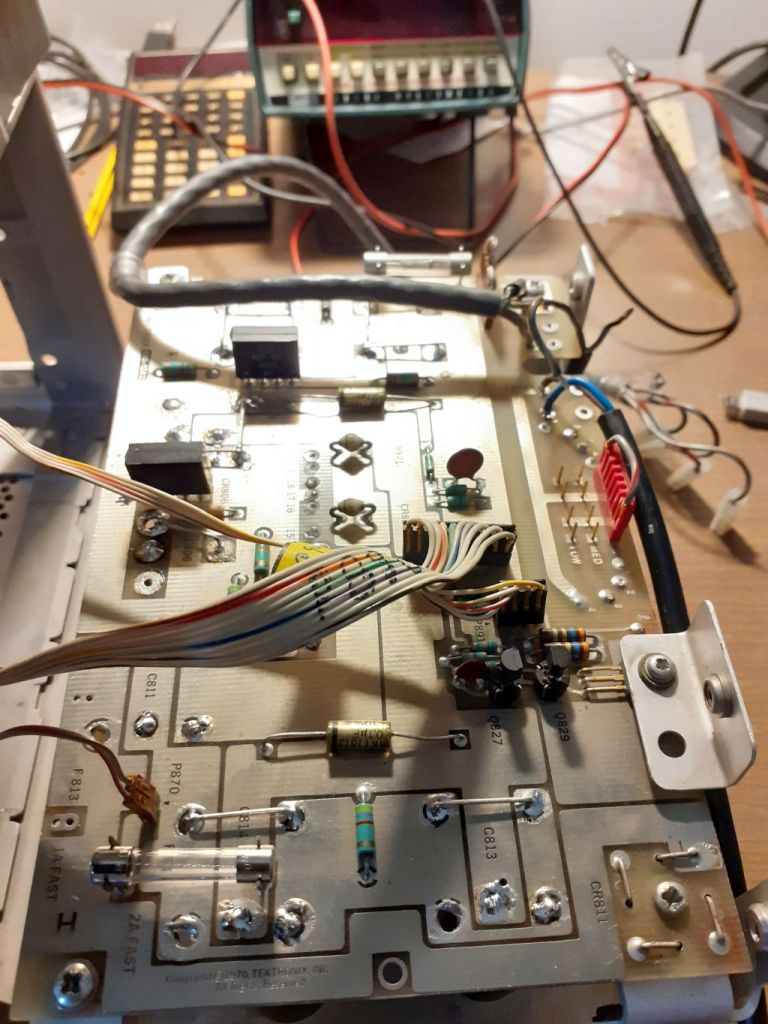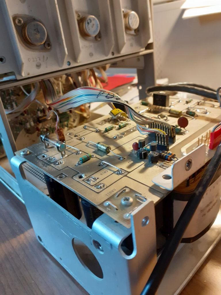 All'accensione l'oscilloscopio finalmente funziona ma mostra un impercettibile "sfarfallio" quando utilizzo un plugin ad elevato assorbimento come ad esempio il 7D20. Dopo diverse ore di test e controlli, la mia attenzione si è focalizzata sul circuito di pilotaggio dell'asse Z, e più precisamente il dc restorer che si trova nella sezione di EAT. Tale sezione è accuratamente inscatolata, isolata e schermata per ovvi motivi.